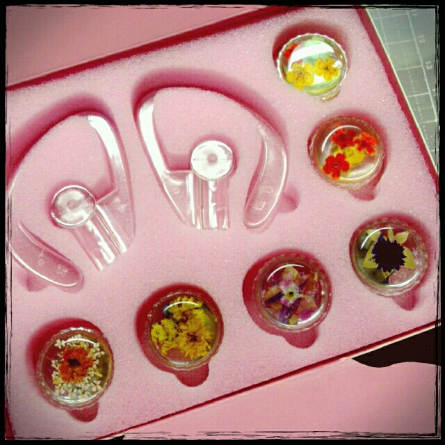 イヤホンハンガー2個、押し花着せ替えアクセ6個、磁石6個。