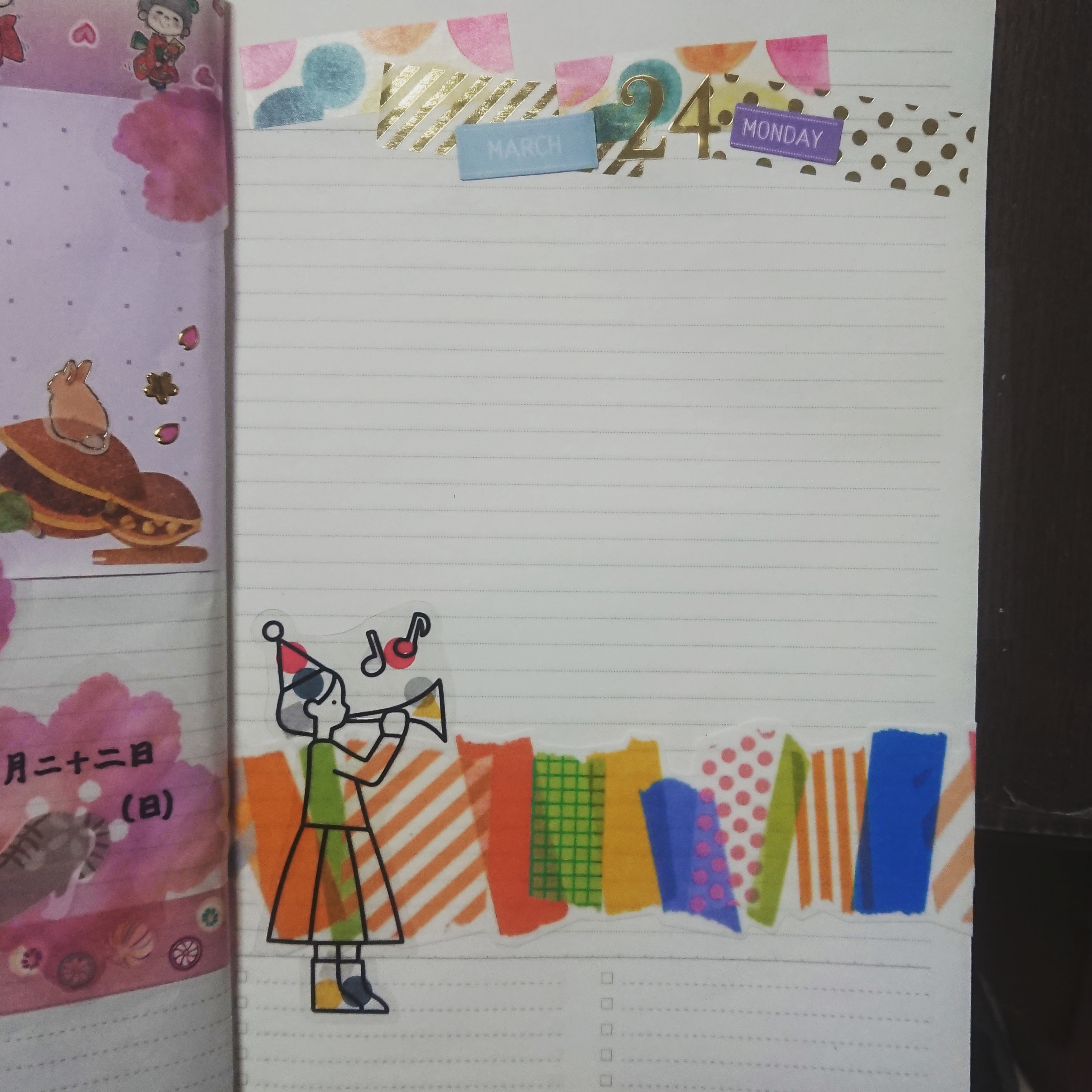 この後に書き込む際にミナペルホネンの蝶のマスキングテープと四角い水彩風のマスキングシールを合わせてカラフルな感じにして賑やかにしました。