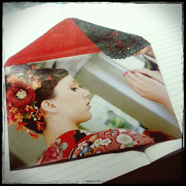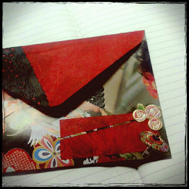 肝心の封筒は鏡に映ったお姉さんの顔がベロに見栄え悪くきちゃったのでダイソーの和紙折り紙の赤を貼り付けてます。