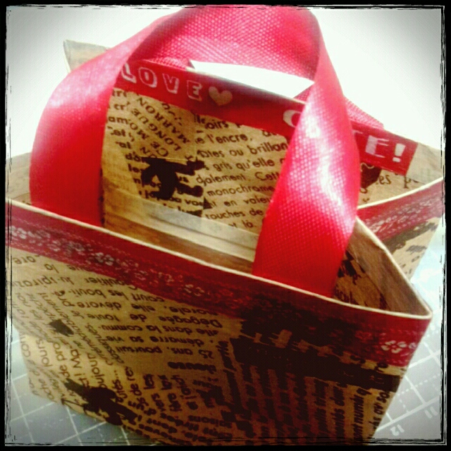 お土産屋さんで貰う様な紙袋から持ち手付きの紙袋にリメイクした物。