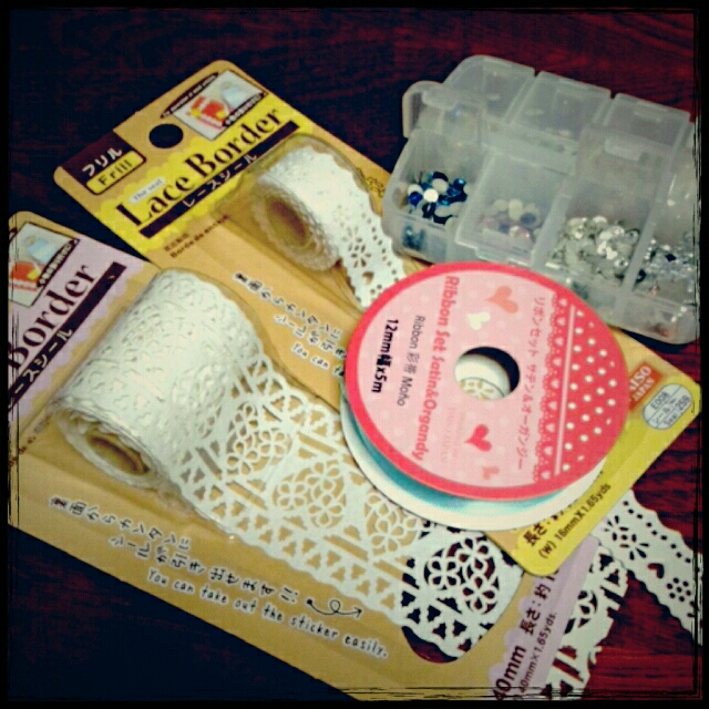 スワロのラインストーンとダイソーのレースシール2種と水色リボン。